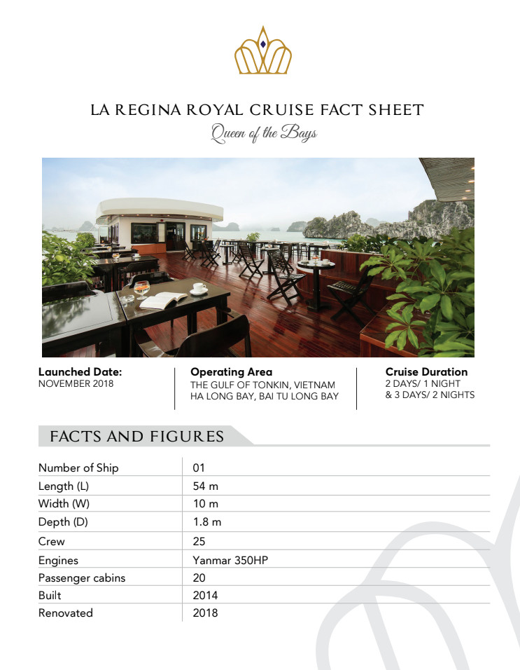 Được nâng cấp từ du thuyền 5 sao Royal Wings, du thuyền La Regina Royal đã chính thức đi vào hoạt đông và đón tiếp các đoàn du khách trong và ngoài nước kể từ ngày 01/11/2018.