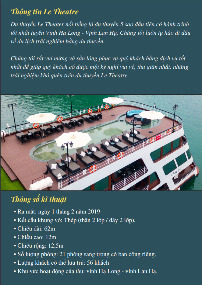 Du thuyền Le Theatre Hạ Long 5 sao có điểm nhấn ở thiết kế tối giản, tinh tế. Đây là một trong những du thuyền sang trọng bậc nhất và đưa du khách khám phá hành trình mới lạ nhất. Du thuyền mang chất lượng tiêu chuẩn từ dịch vụ đến tiện nghi sẽ là sự lựa chọn hoàn hảo cho một kỳ nghỉ đáng nhớ. Hơn nữa, du thuyền còn mang đến nhiều hoạt động, lịch trình nổi bật, hấp dẫn khiến du khách chắc chắn sẽ có những trải nghiệm tuyệt vời với chuyến đi đến di sản thế giới.